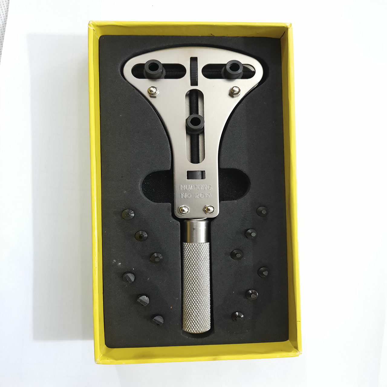آچار جاکس ساعت هواکسینگ مدل H2819 سایز 3 اینچ یک آچار سایز بزرگ مخصوص بازکردن درب ساعت های مچی کاربرد داشته و یک ابزار حرفه ای میباشد که دارای 12 عدد یدکی فولادی بوده که به صورت دقیق روی در ساعت فیکس میشود و از ایجاد خط و خش جلوگیری میکند و جنس این جاکس استیل ضد زنگ میباشد که تمامی ساعت های مچی را پوشش میدهد.