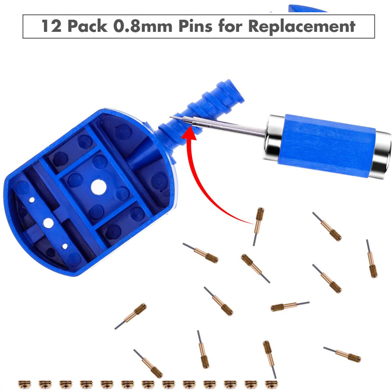 ابزار کوتاه کننده بند ساعت مچی به همراه 10 عدد یدکی همراه جهت کوتاه کردن انواع پین های بند ساعت مخصوصا پین بندهای استیل در ساعت های مچی هوشمند و سایر ساعت های مچی عقربه ای کاربرد دارد و انواع رنگ بندی را شامل میشود که در رنگ های زرد و مشکی و آبی تولید شده و هیچ تفاوتی با هم ندارد